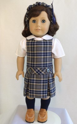 Dropped Waist Jumper American Girl Doll School Uniform in Navy & Grey Plaid. Uniform is shown on the American Girl Doll 'Kitt"