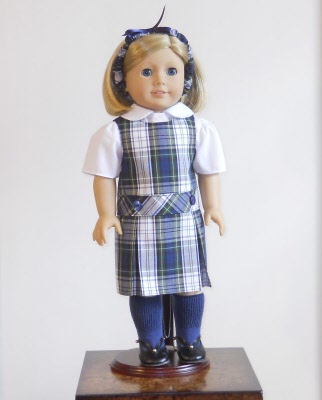 Dropped Waist Jumper American Girl Doll School Uniform in Navy White and Green Plaid #80. Uniform shown on American Girl Doll 'Kitt'