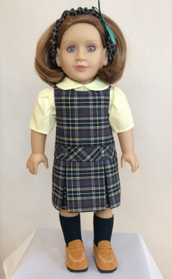 Dropped Waist Jumper American Girl Doll School Uniform in Green and Grey Plaid #44 with Yellow Blouse. Uniform is shown on the 18" My Twinn Doll