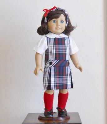 Dropped Waist Jumper American Girl Doll School Uniform in Navy Red and White Plaid #49. Uniform is shown on the American Girl Doll 'Lindsey'