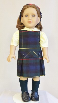 Dropped Waist Jumper American Girl Doll School Uniform in Green Plaid #55 with white turtle neck. Uniform shown on 18" My Twinn Doll